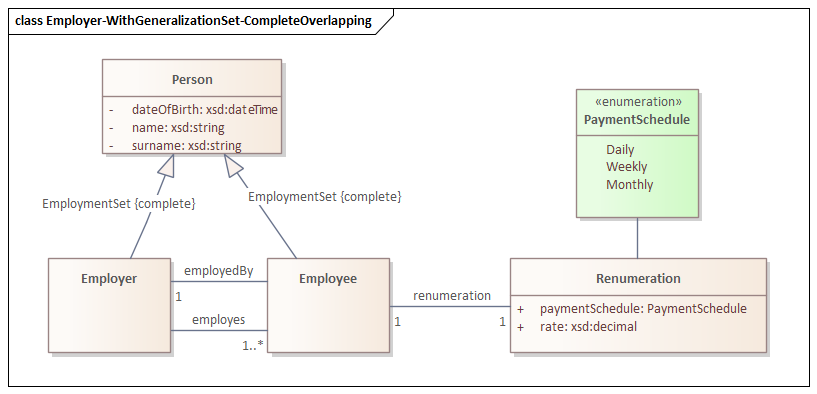 In this diagram, Person is the superclass of Employee and Employer, with a generalization set marked as {complete, overlapping}. This means every Person is at least either an Employee or an Employer (complete), but it is also possible that Person are both (overlapping).